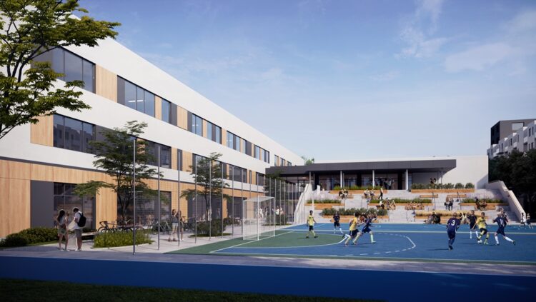 Na terenie szkoły znajdą się również dwa boiska wielofunkcyjne do gry w koszykówkę, siatkówkę, piłkę nożną i piłkę ręczną, a także plac zabaw dla dzieci. Natomiast duże schody terenowe z siedziskami i zielenią, które powstaną na dziedzińcu stworzą swoistą widownię dla gier sportowych i będą miejscem spotkań dla uczniów. Przewidziane są również liczne nasadzenia zieleni. Budowa boisk nie jest przedmiotem podpisanej umowy. Te prace zostaną zlecone w oddzielnym postępowaniu. Boiska będą gotowe w tym samym czasie co szkoła.