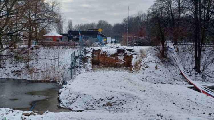 Rozpoczęte prace, niestety, zostały wstrzymane. Podczas prowadzonych wykopów po obydwu stronach mostku odkryto fragmenty starego muru ceglanego. Prawdopodobnie jest to część piwniczna dawnej cegielni. Zgodnie z procedurą kierownik budowy zgłosił ten fakt do biura Mazowieckiego Wojewódzkiego Konserwatora Zabytków. W czwartek, 2 lutego na miejscu budowy, w obecności przedstawiciela Mazowieckiego Wojewódzkiego Konserwatora Zabytków został spisany protokół, dotyczący czasowego wstrzymania robót budowlanych. Konserwator musi określić, czy odkopany podczas prac budowlanych obiekt posiada charakter historyczno- archeologiczny, mówiąc krótko, czy nosi znamiona zabytku. Od tego będą zależeć dalsze kroki.
