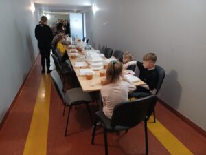 Nie inaczej jest na Ochocie. Odwiedziliśmy jeden z punktów przeznaczonych dla uchodźców. Jest wczesne popołudnie. W środku gwarno, wiele krzątających się osób – wolontariusze, ale przede wszystkim uchodźcy z Ukrainy. Wśród nich spora grupa dzieci. Zaczyna się pora wydawania posiłków. Miejsca przy stole powoli zaczynają się zapełniać. Oczywiście, przy stole pierwsze pojawiają się dzieciaki. One chyba najlepiej znoszą to wszystko, bo nie do końca zdają sobie sprawę z tego co się dzieje. Dzieci, jak to dzieci – śmieją się, bawią. Zupełnie inaczej dorośli. Na ich twarzach widać skupienie, ale przede wszystkim oznaki wyczerpania. Dzieciom udostępniono jedno z pomieszczeń do zabawy. Na korytarzu lodówka oklejona napisami w języku ukraińskim. Na stołach różne potrzebne rzeczy – żywność, środki higieny osobistej, ubrania. Ogólnie rzeczy niezbędne do funkcjonowania. W jednej z sal widnieją rozłożone materace. To właśnie tutaj uchodźcy nocują.