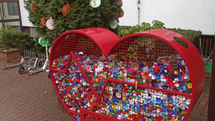 Cała akcja została zainicjowana przez trzy energiczne nauczycielki: Anetę Mrozek, Beatę Szawiołę oraz Longinę Brodowską, które chciały zrobić coś pożytecznego dla lokalnej społeczności. Nakrętki trafiające do kosza w kształcie serca zostaną przekazane na cele charytatywne za pośrednictwem Fundacji Dzieciom „Zdążyć z pomocą”. Serce jest regularnie opróżniane, nad czym czuwają panie zajmujące się wolontariatem w tej placówce: Edyta Kucharska i Jolanta Błażewicz. Od momentu, kiedy kosz stanął na placu przed szkołą, według wyliczeń, udało się zebrać ponad 130 000 plastikowych nakrętek, które pomogą przy zakupie sprzętu niezbędnego dla dzieci niepełnosprawnych.